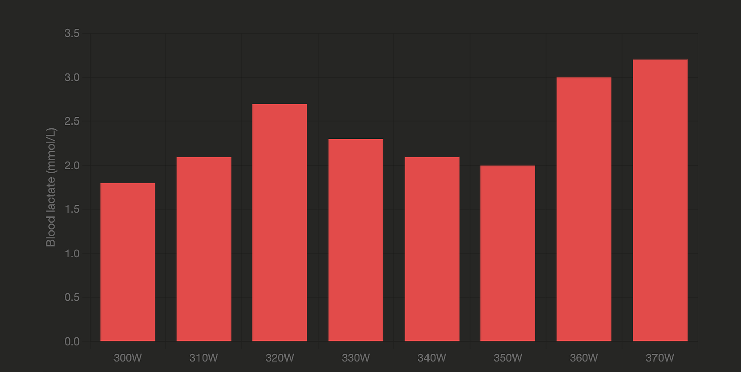 On Thursday, my session was 8 times 10 minutes. I progressed the power from 300 to 370 Watts and took a lactate measurement at the end of each interval. All of these felt sub-maximal, I wrote down my RPE at the end of each block and the highest it was (after 370W) was a 7 out of 10 and my heart rate here was about 84% of max heart rate. The lactate values are quite interesting and validate my feeling that I could have gone way harder (which is good, the session was 8 x 10 minutes threshold not 8 x 10 minutes as hard as possible).