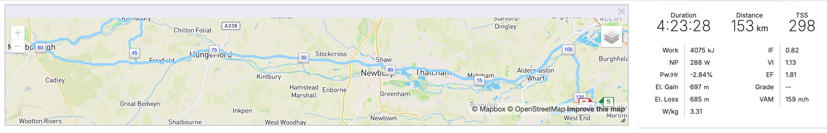 The bike session can be viewed on Strava here. My average power for the whole ride was 277W for 2.5 hours, the normalised power was 302W and my average heart rate was 157bpm.