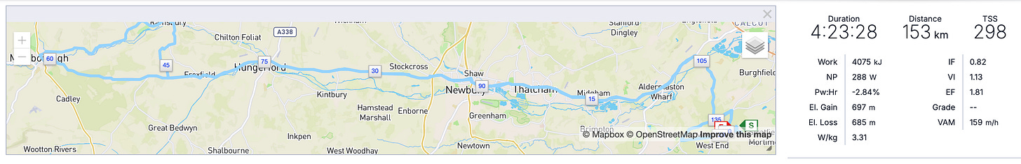 I had a 4.5 hour ride with 2 x 50 minutes at Ironman pace planned. Instead I did the intervals slightly differently due to towns getting in the way so I did 40 minutes (295W), 20 minutes (290W), 25 minutes (294W), 24 minutes (as a club TT - 349W).