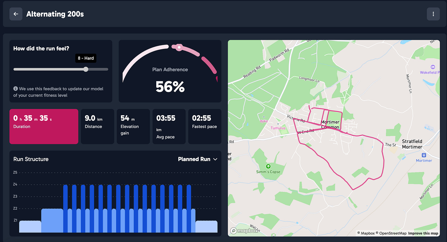 After this ride I went for a run, the session was “alternating 200s” as 200m in zone 4, 200m in zone 2. My average pace was 3:55/km for 9k off the bike which felt really good considering it was such a hard ride. Session prescribed by The Running Algorithm of course.