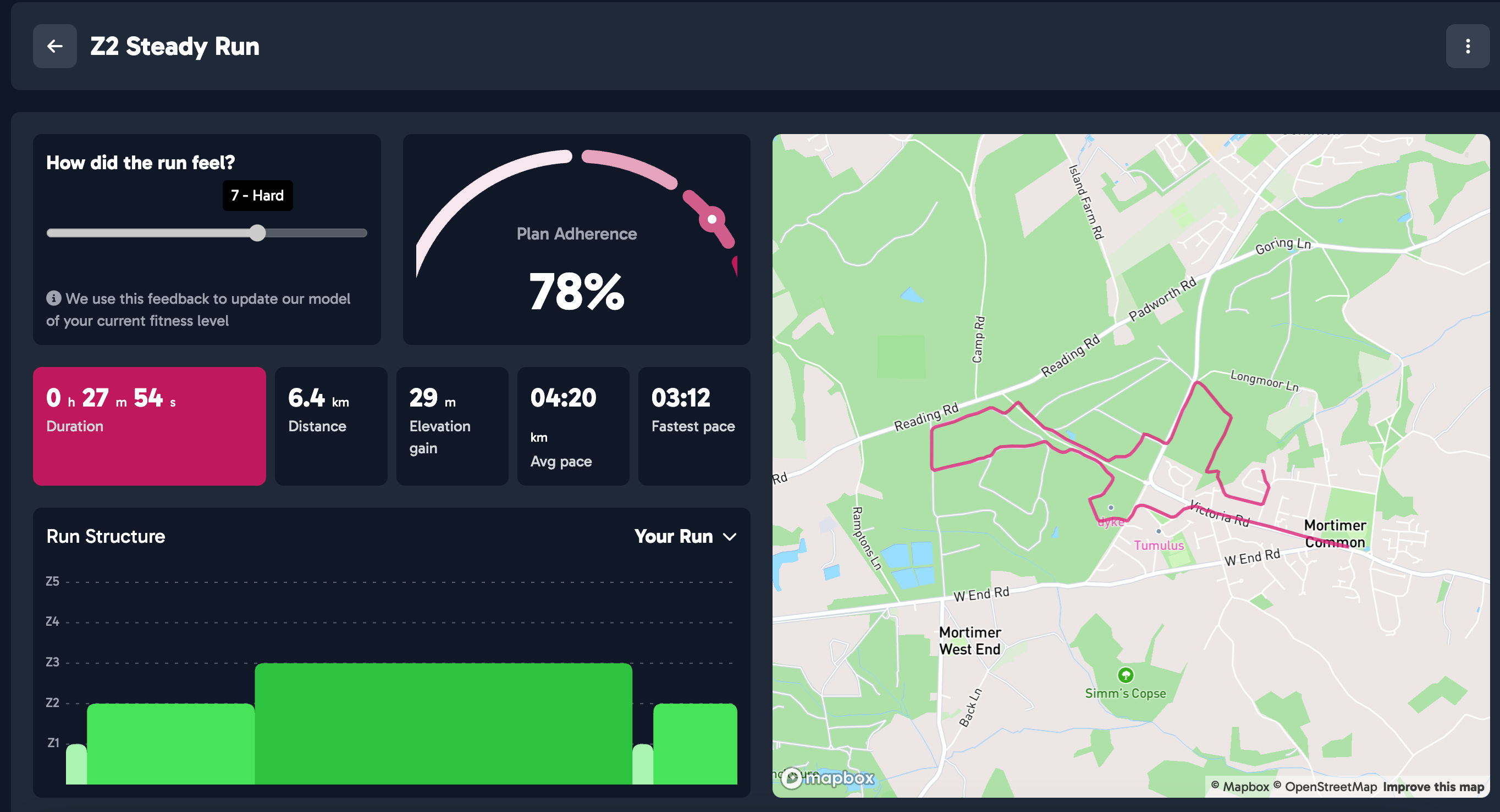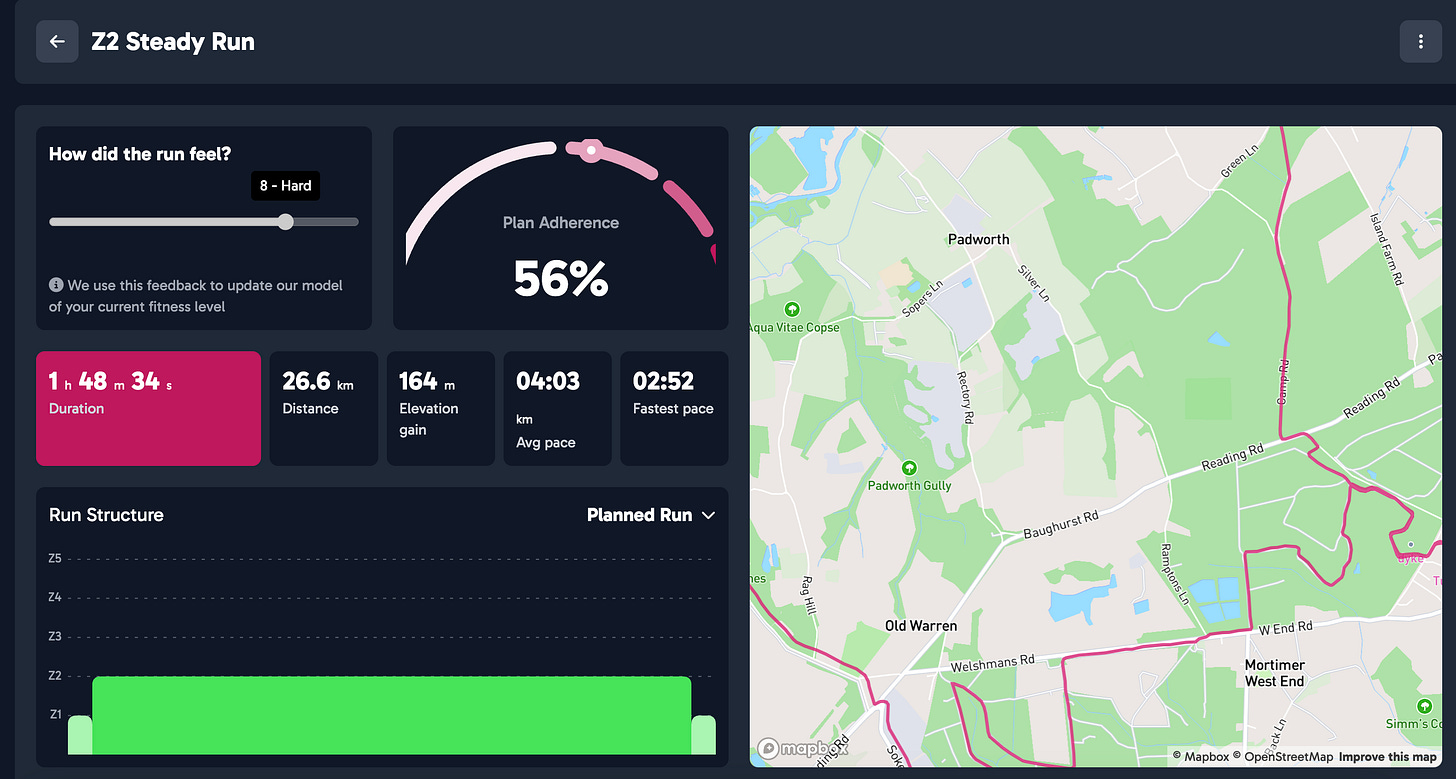 The Running Algorithm gave me my longest ever run and it was 27km. I did it too fast which is why the adherence score is so low.